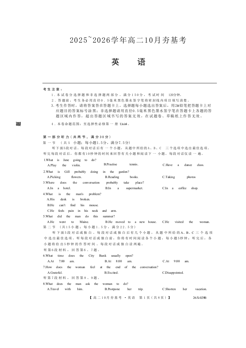 高二英语--山西省三晋卓越联盟2025-2026学年高二10月夯基考