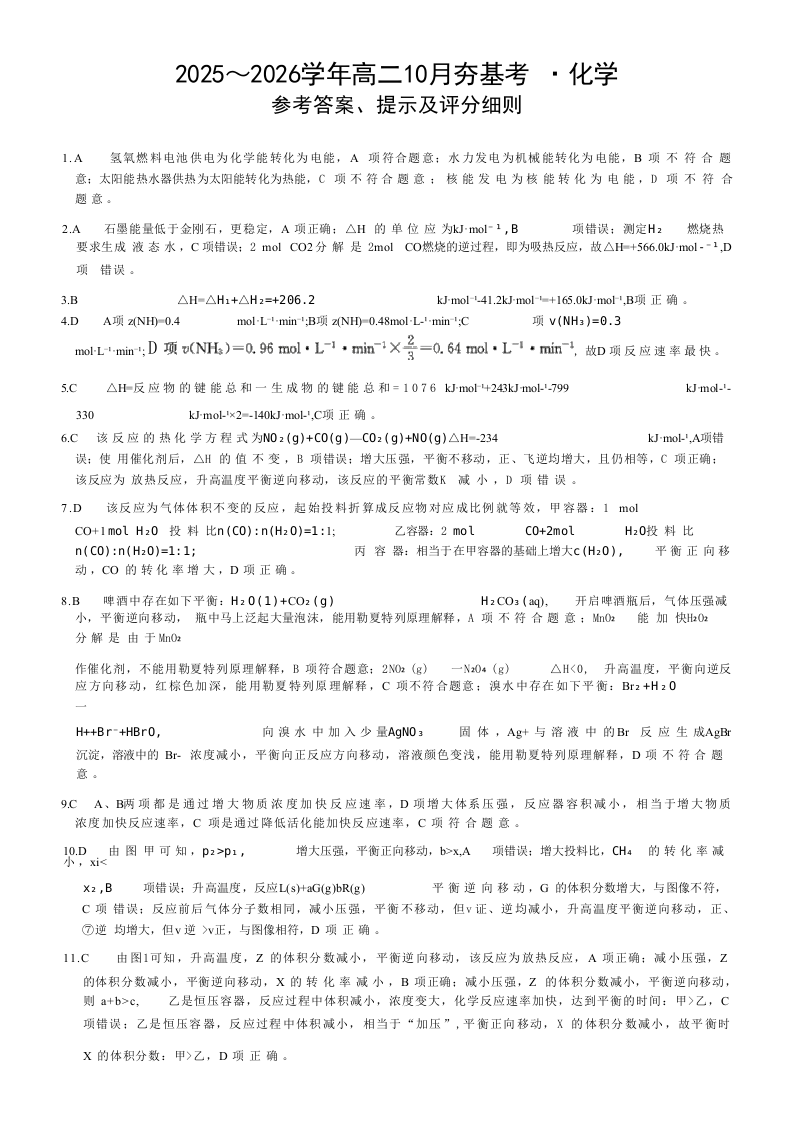 高二化学答案--山西省三晋卓越联盟2025-2026学年高二10月夯基考