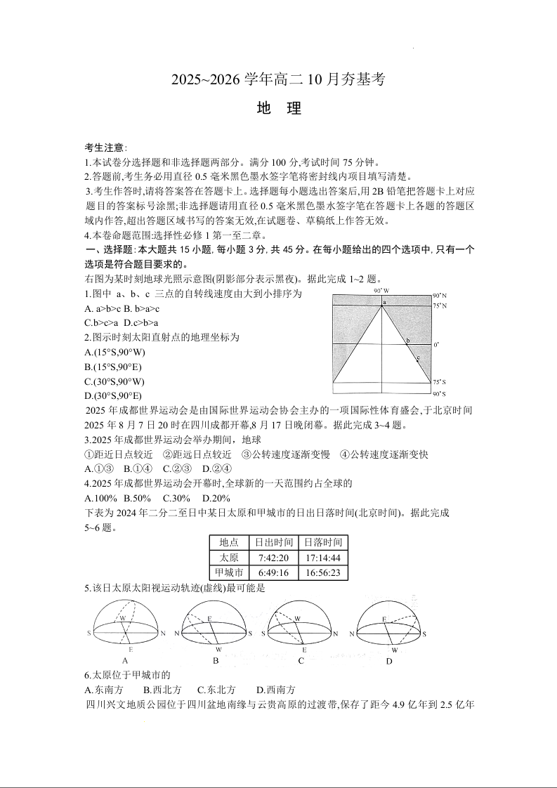 高二地理--山西省三晋卓越联盟2025-2026学年高二10月夯基考