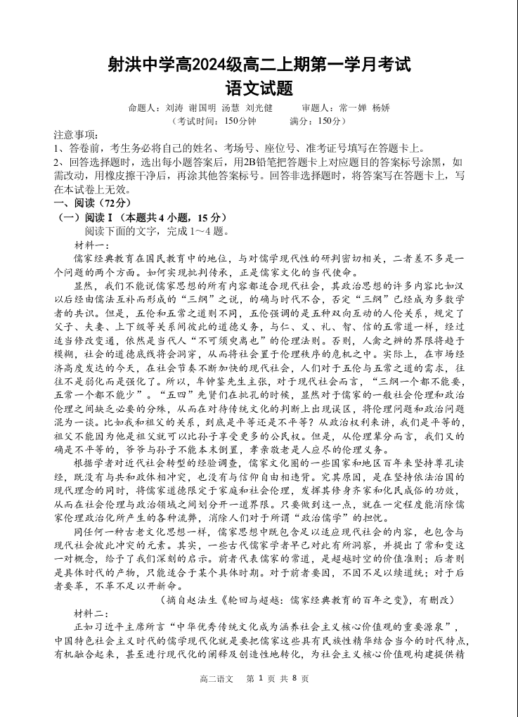 高二语文--四川省遂宁市射洪中学2025-2026学年高二上学期10月月考
