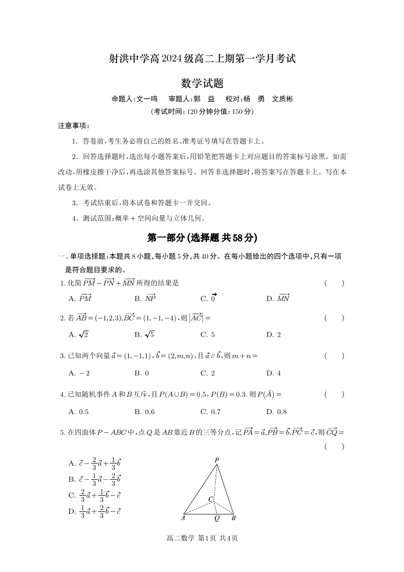 高二数学--四川省遂宁市射洪中学2025-2026学年高二上学期10月月考