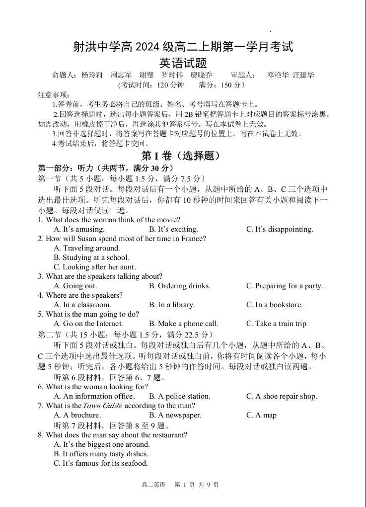 高二英语--四川省遂宁市射洪中学2025-2026学年高二上学期10月月考