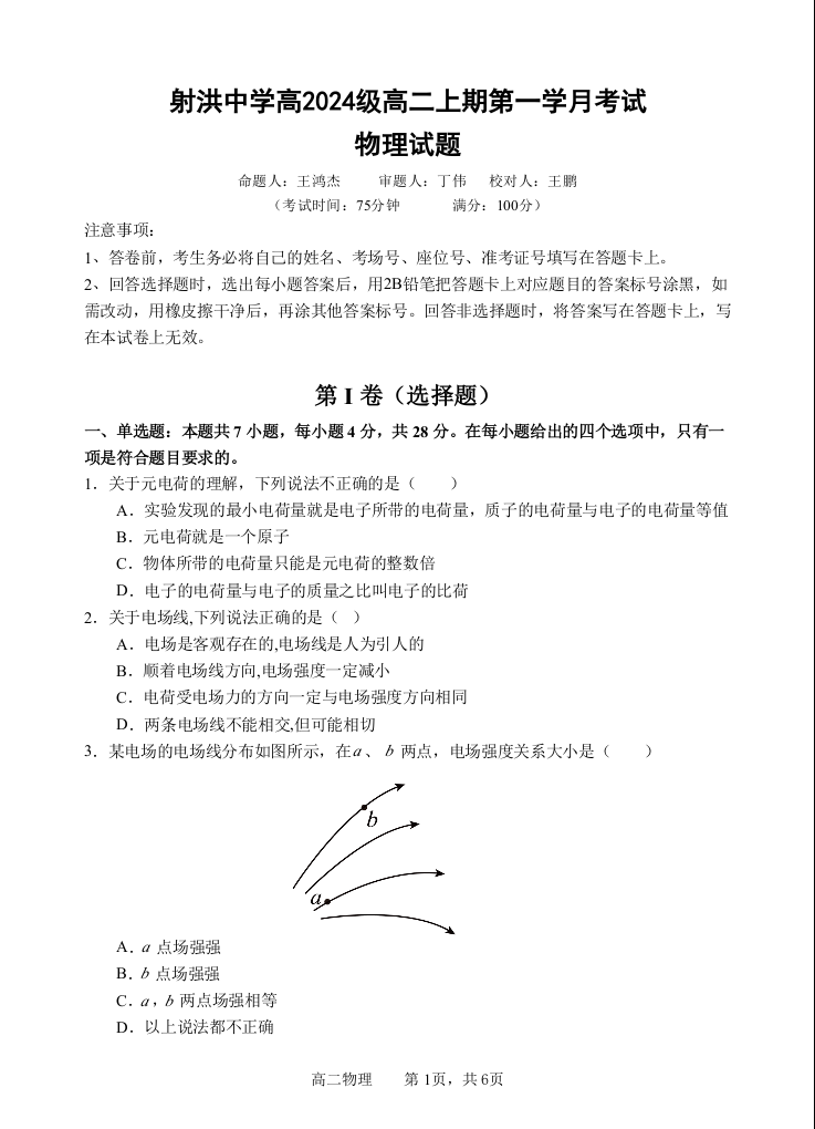 高二物理--四川省遂宁市射洪中学2025-2026学年高二上学期10月月考