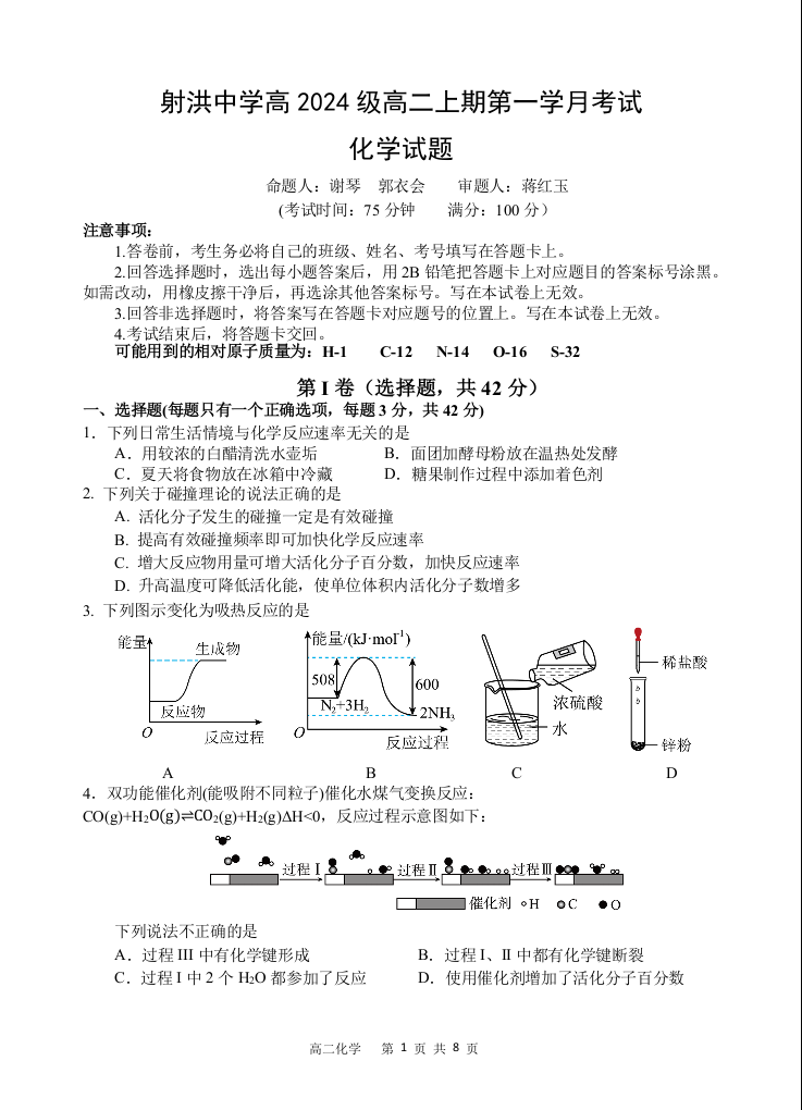 高二化学--四川省遂宁市射洪中学2025-2026学年高二上学期10月月考