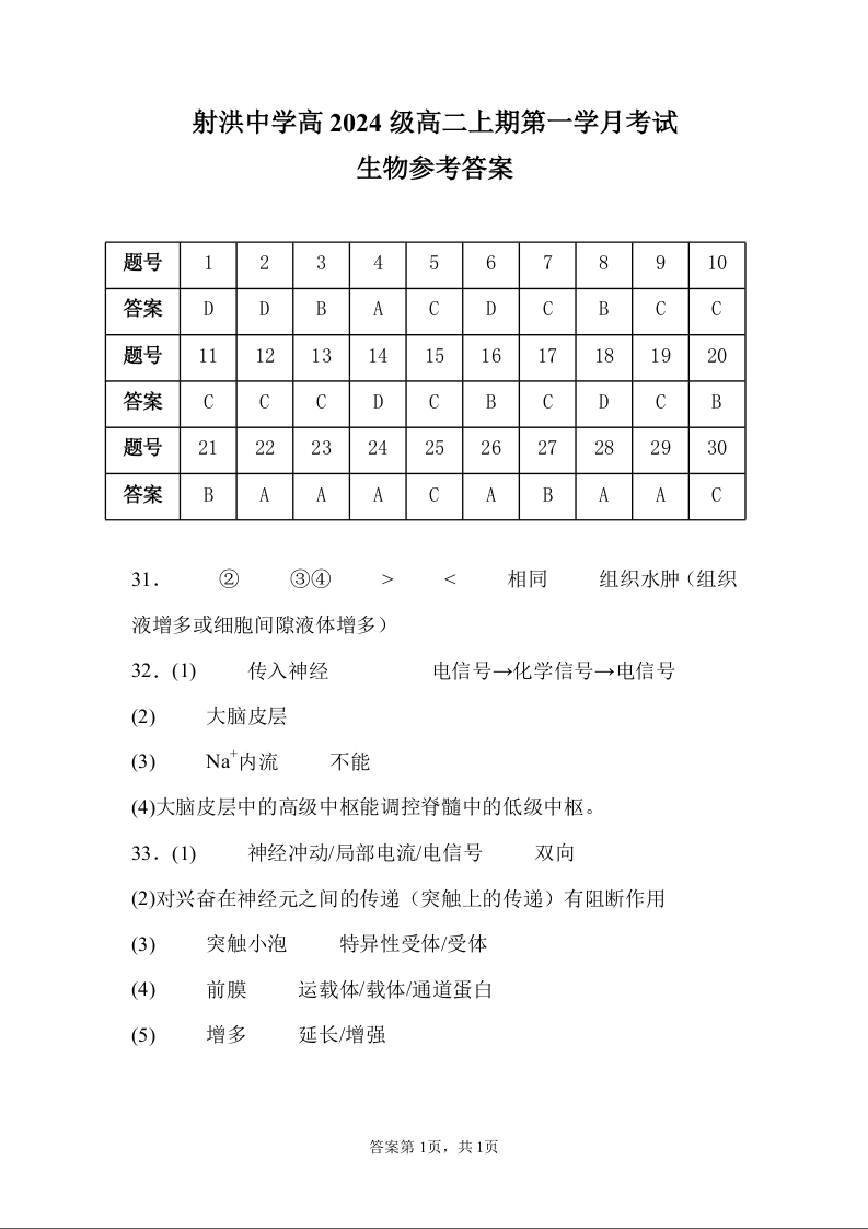 高二生物答案--四川省遂宁市射洪中学2025-2026学年高二上学期10月月考