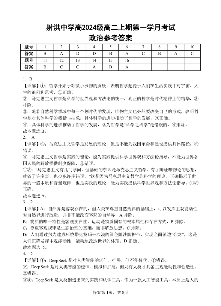 高二政治答案--四川省遂宁市射洪中学2025-2026学年高二上学期10月月考