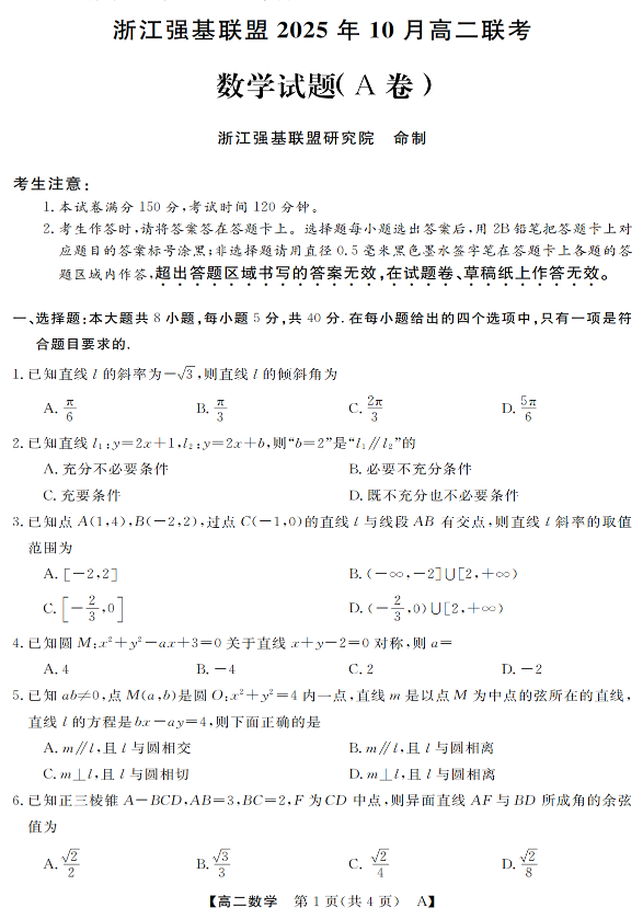 高二数学+答案--浙江省强基联盟2025-2026学年高二上学期10月联考A卷