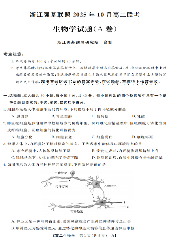 高二生物+答案--浙江省强基联盟2025-2026学年高二上学期10月联考A卷
