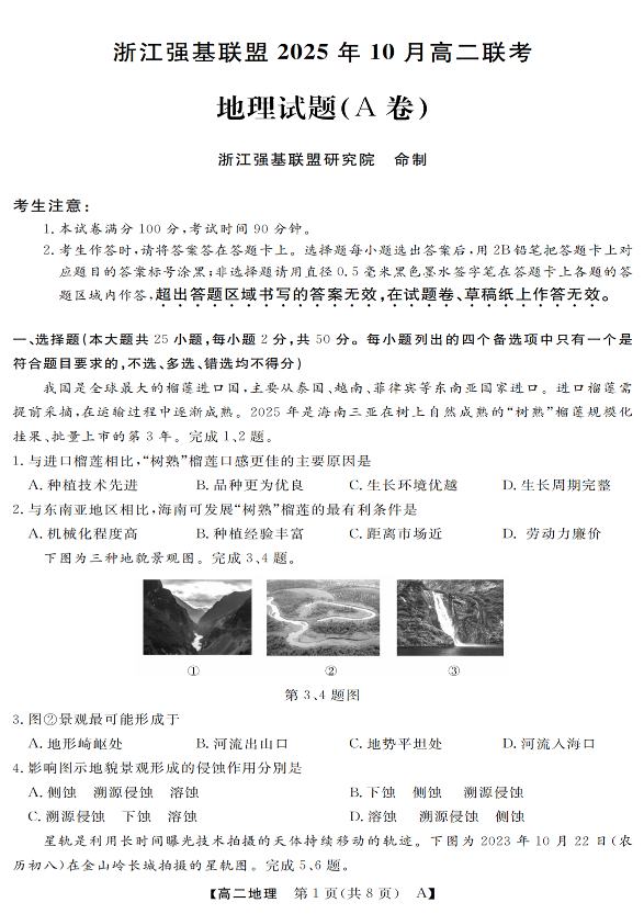 高二地理+答案--浙江省强基联盟2025-2026学年高二上学期10月联考A卷