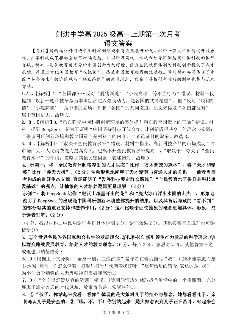 高一语文答案--四川省遂宁市射洪中学2025-2026学年高一上学期10月月考