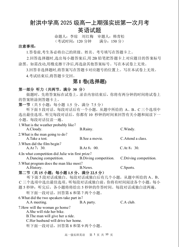 高一英语--四川省遂宁市射洪中学2025-2026学年高一上学期10月月考