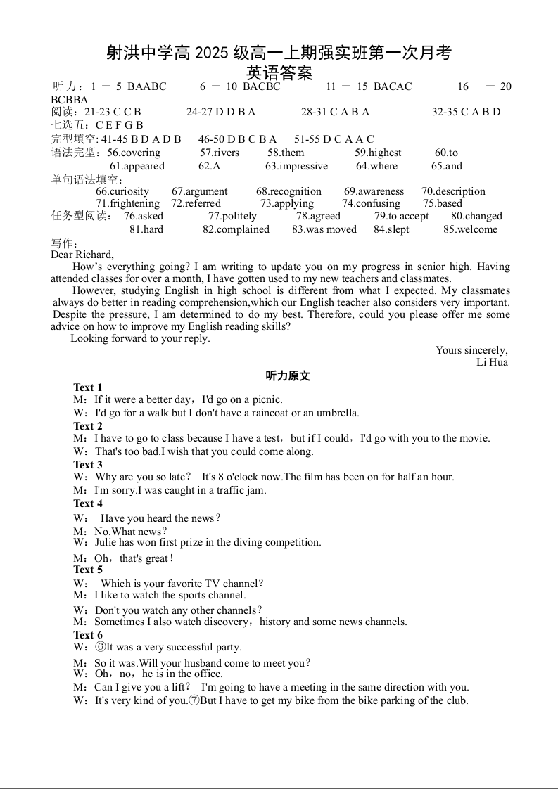 高一英语答案--四川省遂宁市射洪中学2025-2026学年高一上学期10月月考