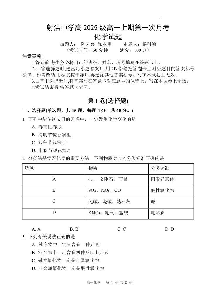 高一化学--四川省遂宁市射洪中学2025-2026学年高一上学期10月月考