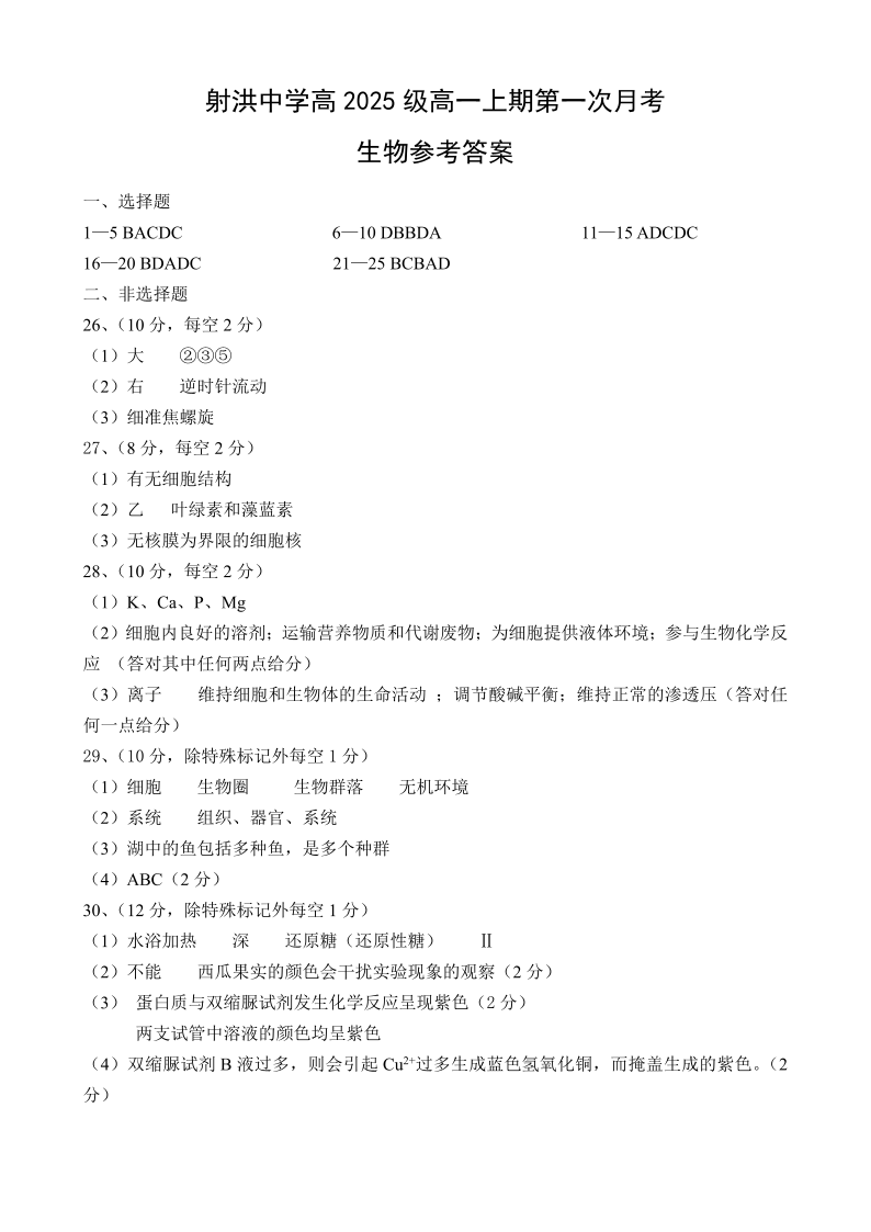 高一生物答案--四川省遂宁市射洪中学2025-2026学年高一上学期10月月考