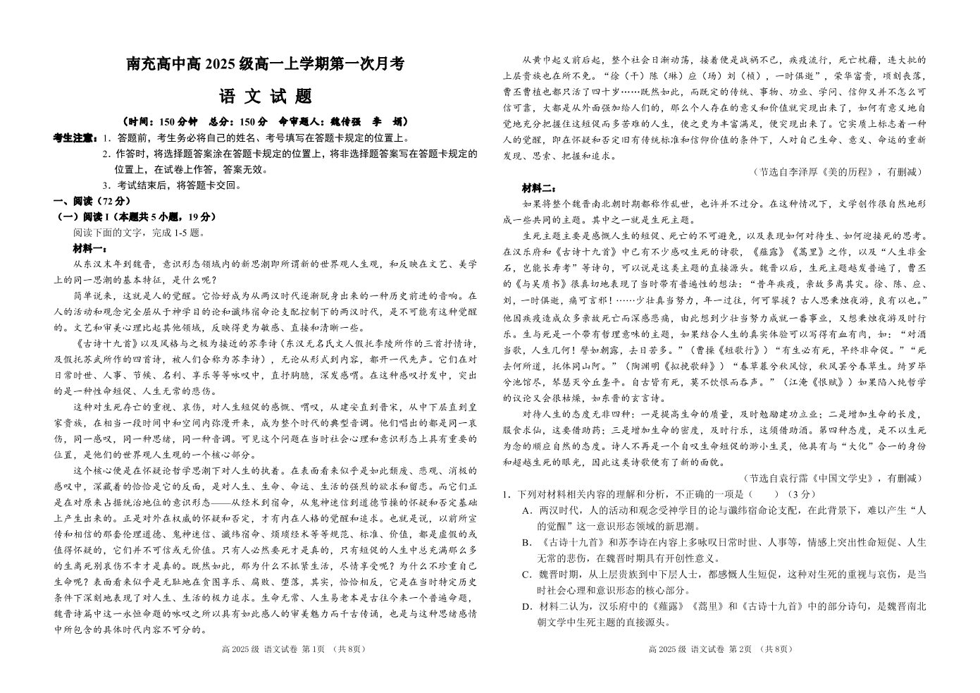高一语文--四川省南充高级中学2025-2026学年高一上学期10月月考