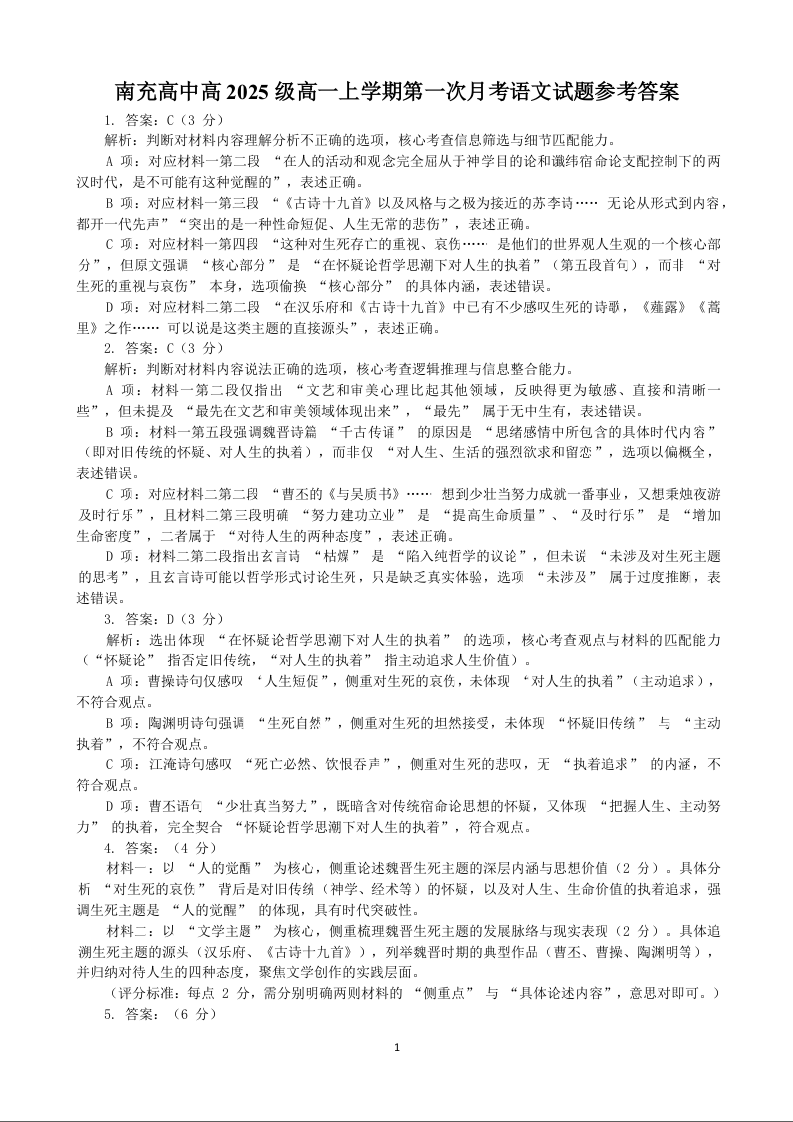 高一语文答案--四川省南充高级中学2025-2026学年高一上学期10月月考