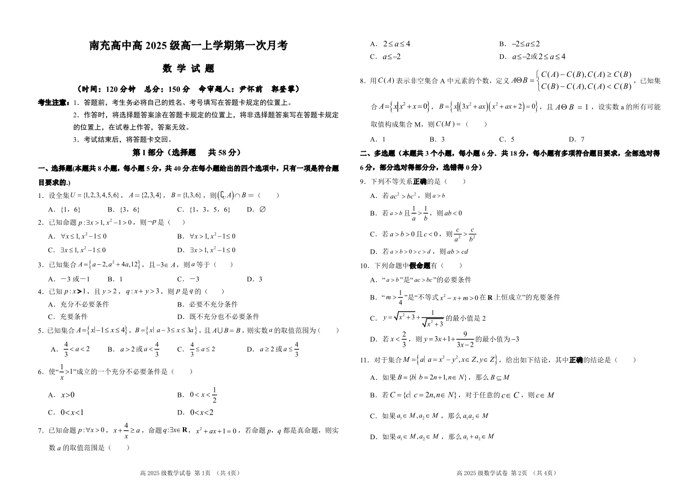 高一数学--四川省南充高级中学2025-2026学年高一上学期10月月考
