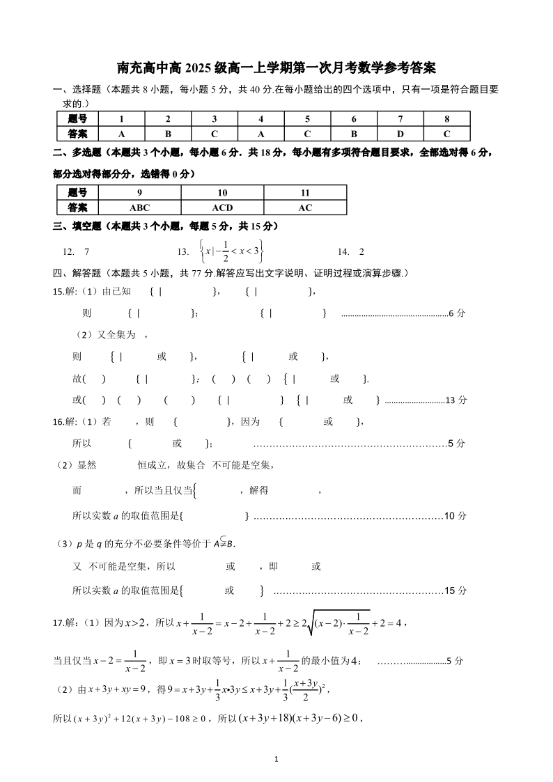 高一数学答案--四川省南充高级中学2025-2026学年高一上学期10月月考