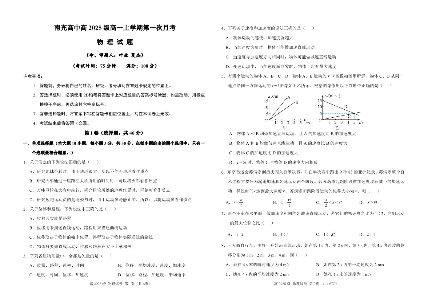 高一物理--四川省南充高级中学2025-2026学年高一上学期10月月考