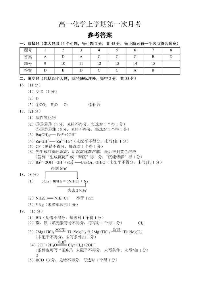 高一化学答案--四川省南充高级中学2025-2026学年高一上学期10月月考