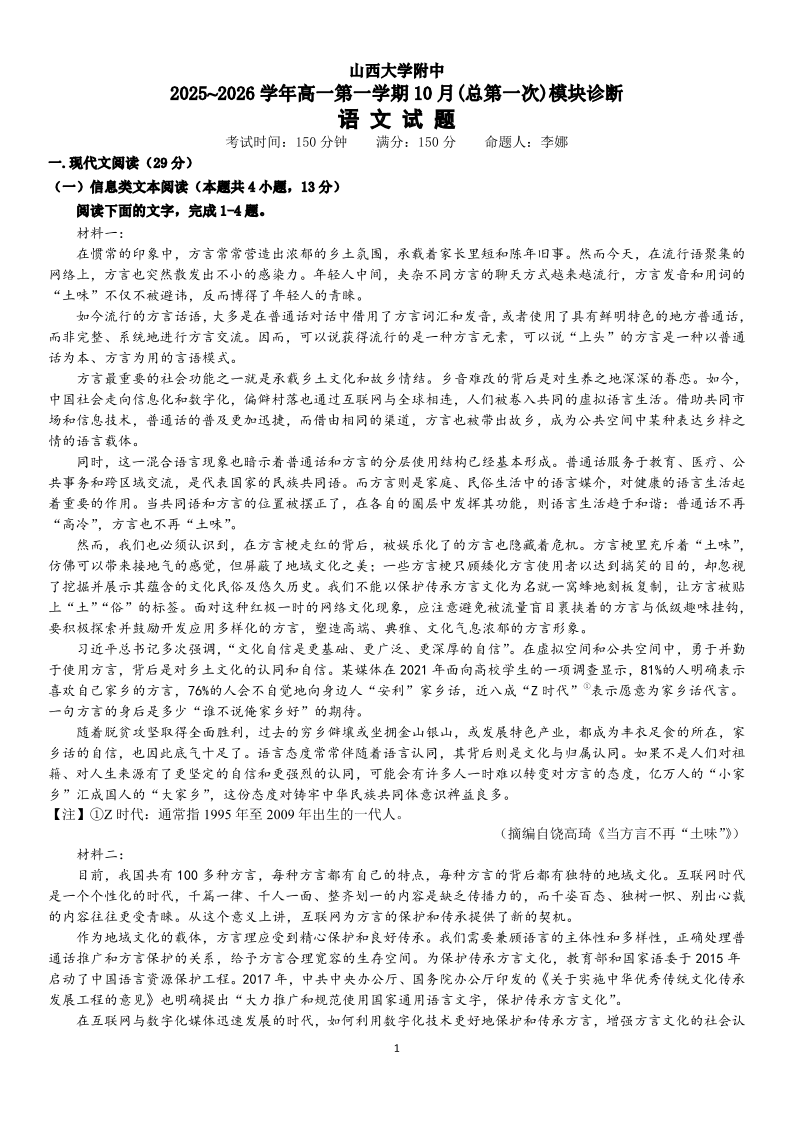 高一语文--山西省太原市山西大学附属中学校2025-2026学年高一上学期10月月考