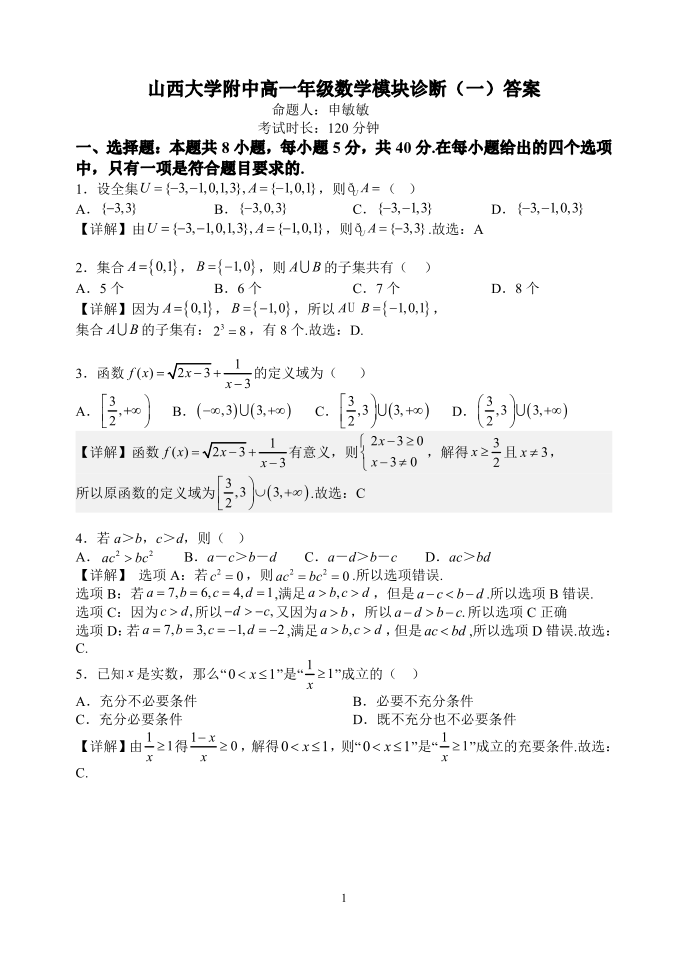 高一数学答案--山西省太原市山西大学附属中学校2025-2026学年高一上学期10月月考