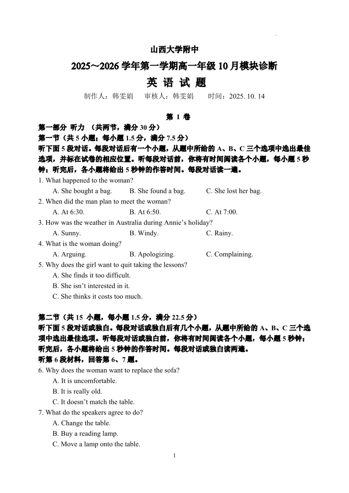 高一英语--山西省太原市山西大学附属中学校2025-2026学年高一上学期10月月考