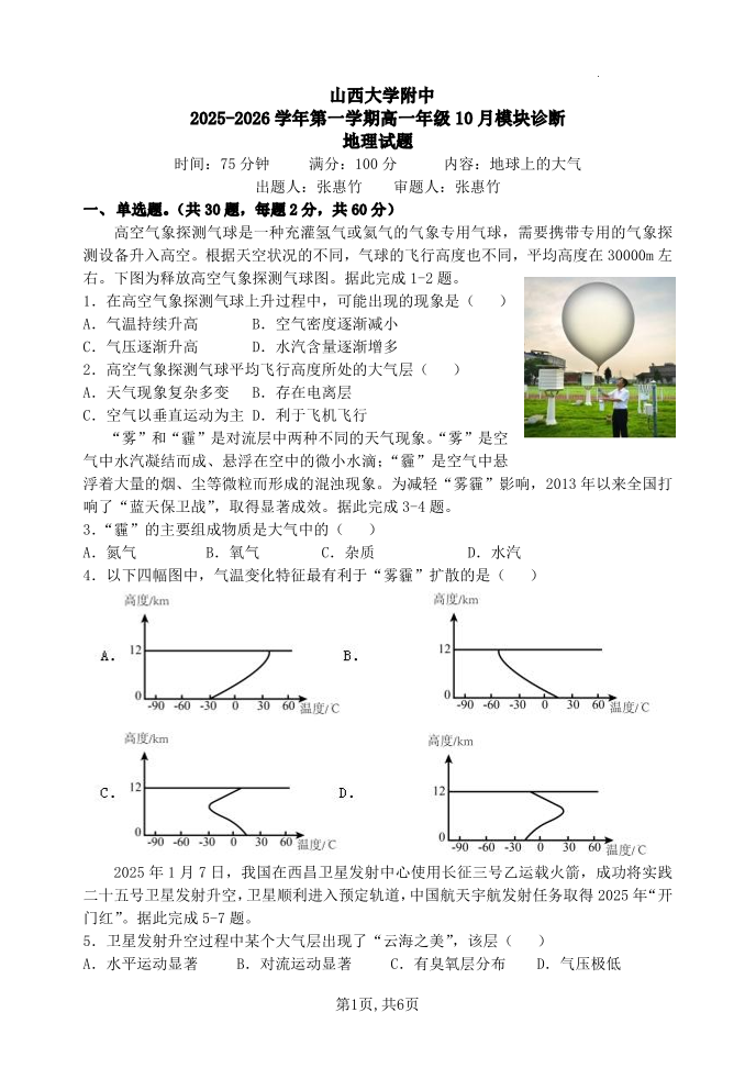 高一地理--山西省太原市山西大学附属中学校2025-2026学年高一上学期10月月考