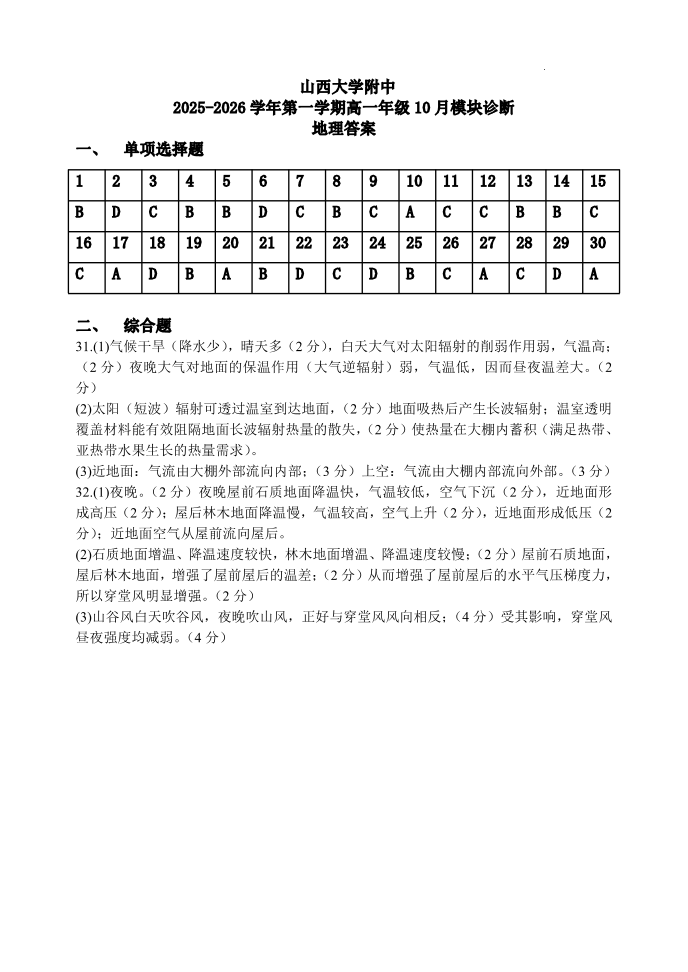 高一地理答案--山西省太原市山西大学附属中学校2025-2026学年高一上学期10月月考