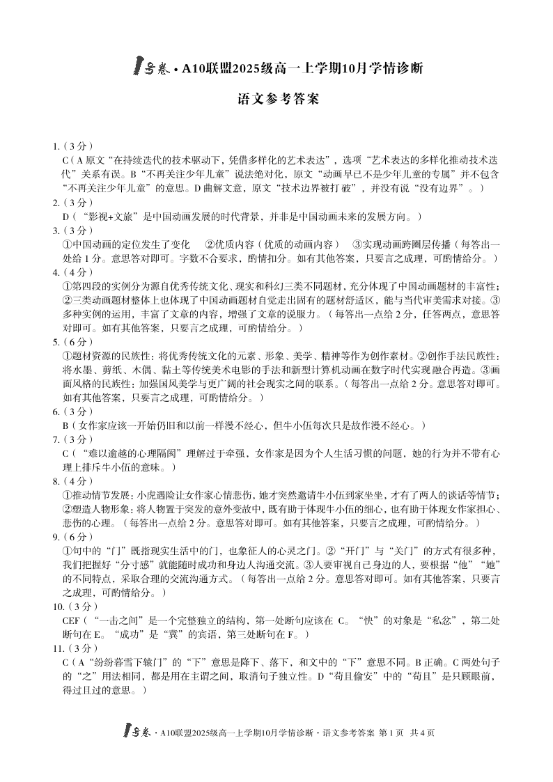 高一语文答案--安徽省1号卷·A10联盟2025-2026学年高一上学期10月学情诊断