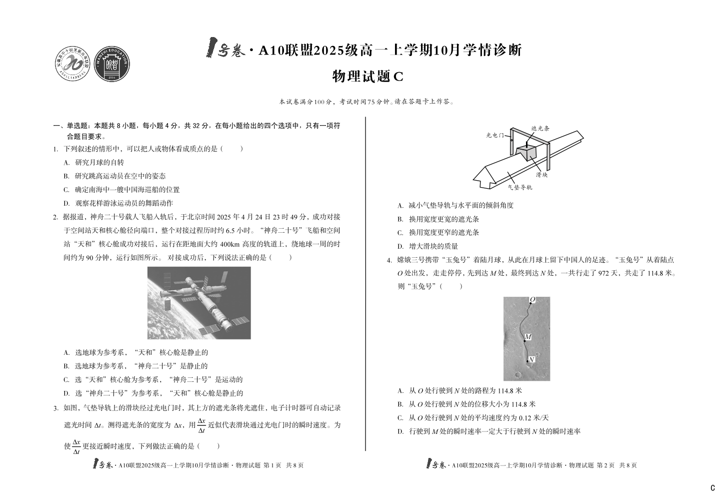 高一物理C--安徽省1号卷·A10联盟2025-2026学年高一上学期10月学情诊断