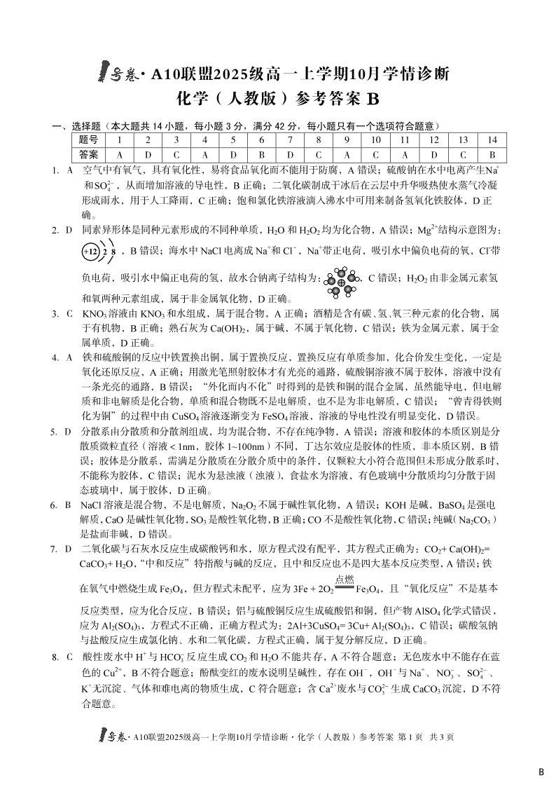 高一化学(人教版)A答案--安徽省1号卷·A10联盟2025-2026学年高一上学期10月学情诊断