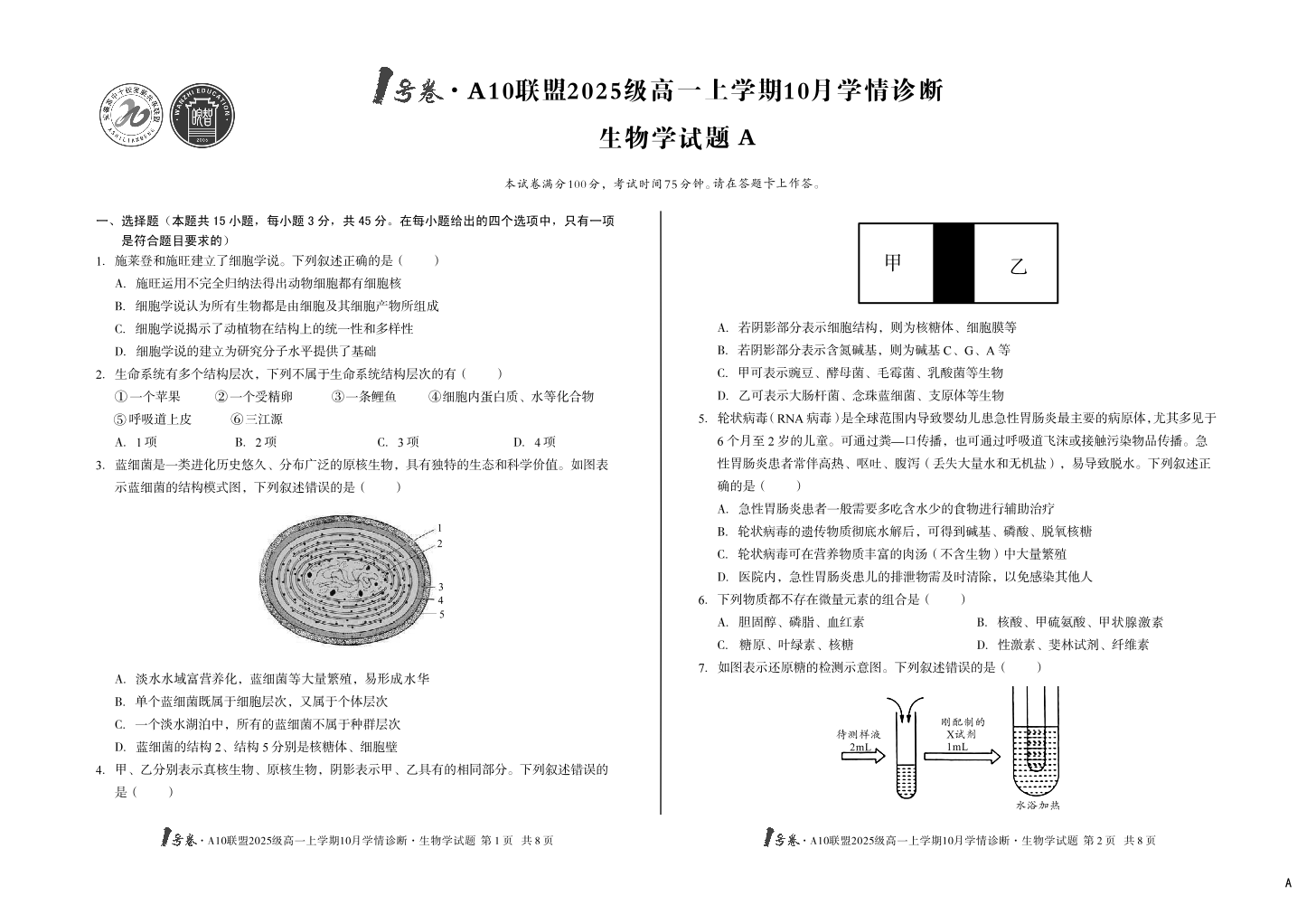 高一生物A--安徽省1号卷·A10联盟2025-2026学年高一上学期10月学情诊断
