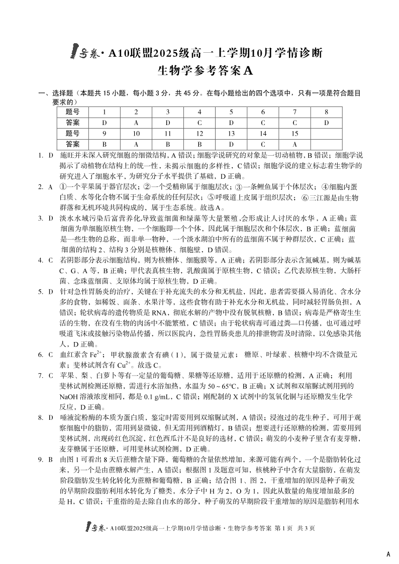 高一生物A答案--安徽省1号卷·A10联盟2025-2026学年高一上学期10月学情诊断