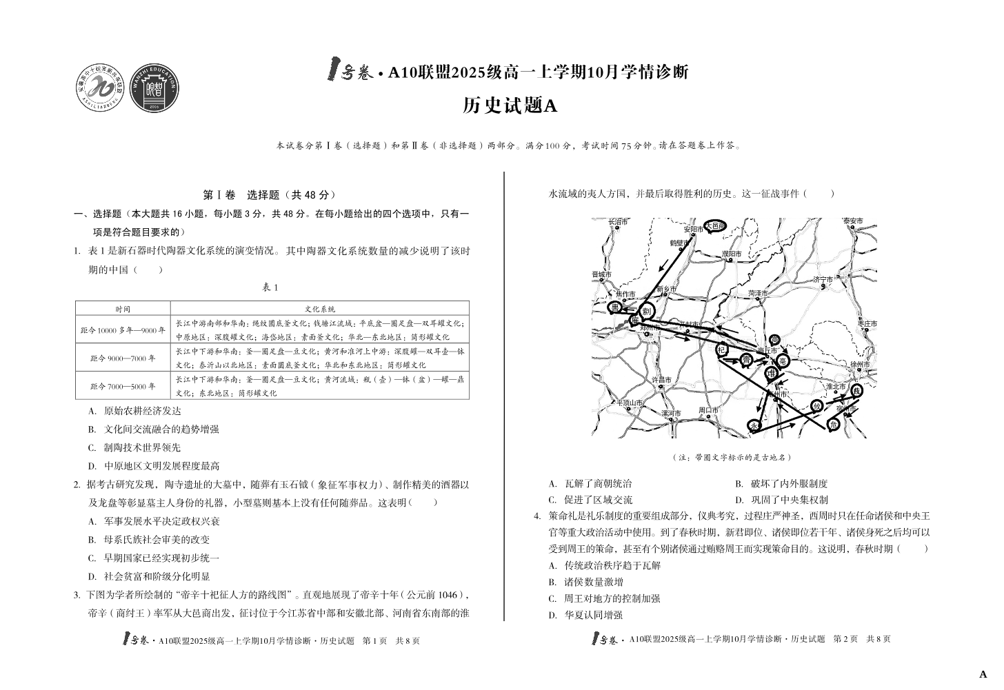 高一历史A--安徽省1号卷·A10联盟2025-2026学年高一上学期10月学情诊断