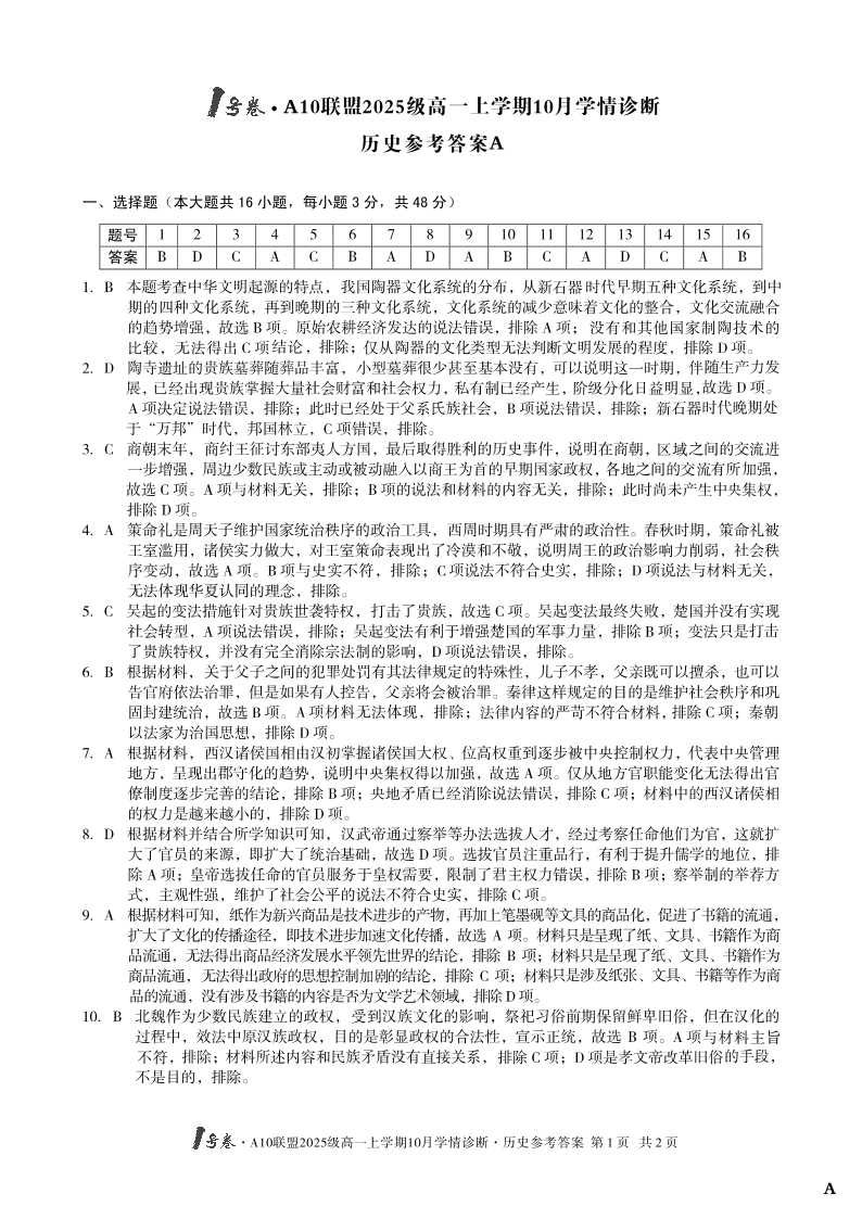 高一历史A答案--安徽省1号卷·A10联盟2025-2026学年高一上学期10月学情诊断