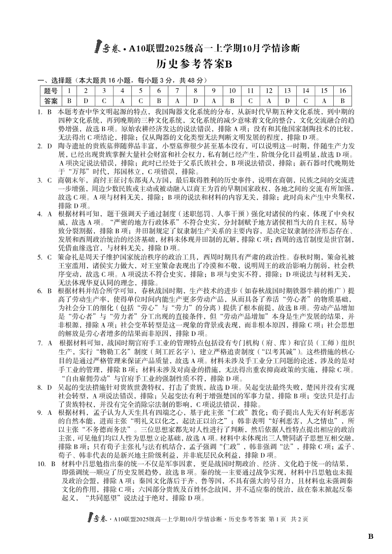 高一历史B答案-安徽省1号卷·A10联盟2025-2026学年高一上学期10月学情诊断