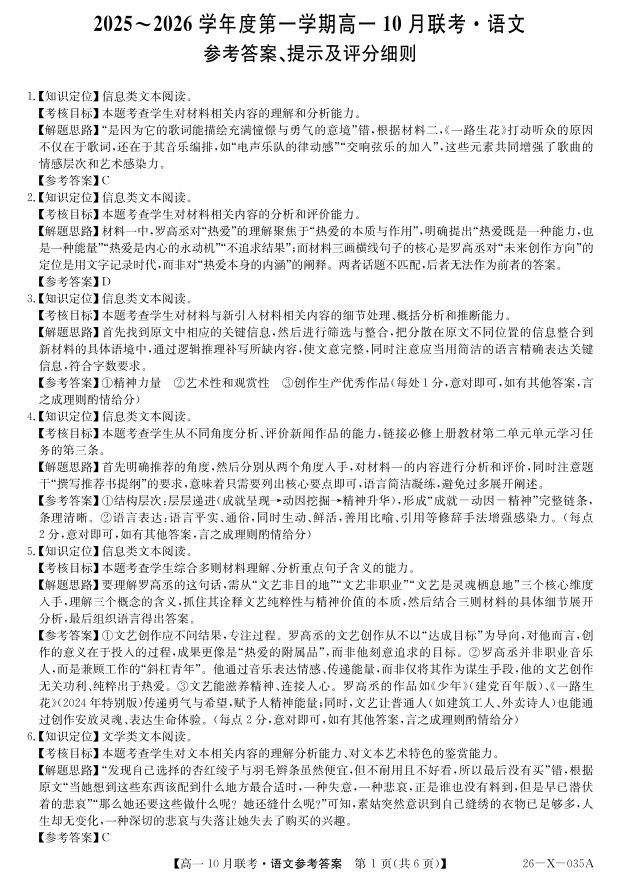 高一语文答案-安徽省县中联盟2025~2026学年度第一学期高一10月联考