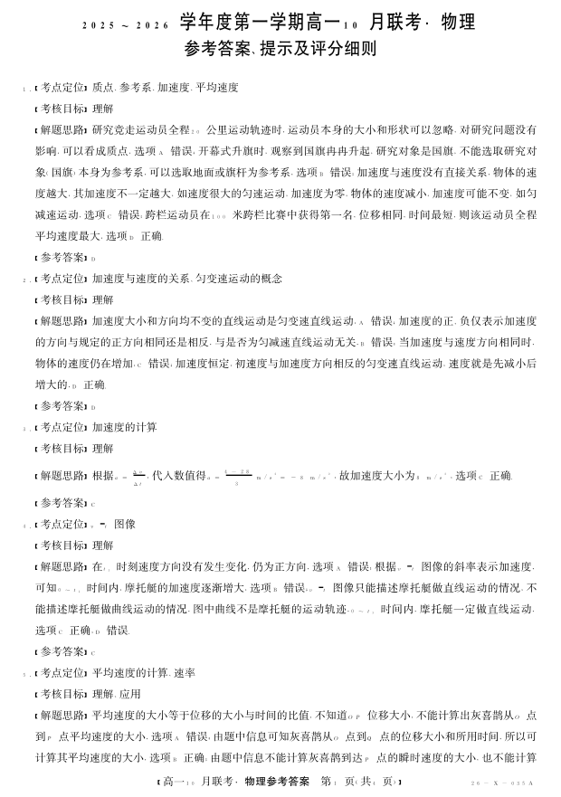 高一物理答案--安徽省县中联盟2025~2026学年度第一学期高一10月联考