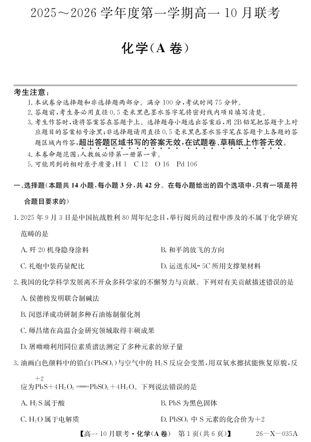 高一化学--安徽省县中联盟2025~2026学年度第一学期高一10月联考