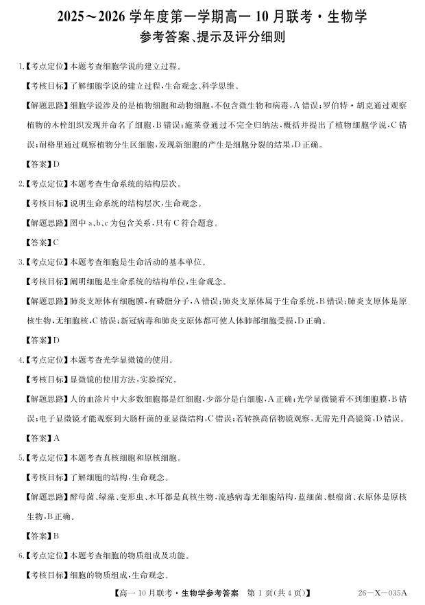 高一生物答案--安徽省县中联盟2025~2026学年度第一学期高一10月联考