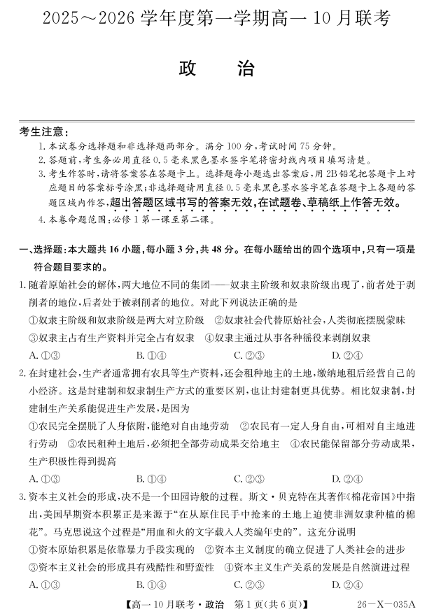 高一政治--安徽省县中联盟2025~2026学年度第一学期高一10月联考