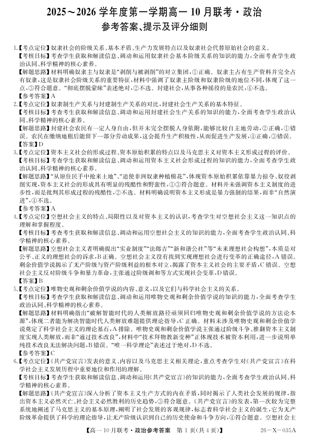 高一政治答案--安徽省县中联盟2025~2026学年度第一学期高一10月联考