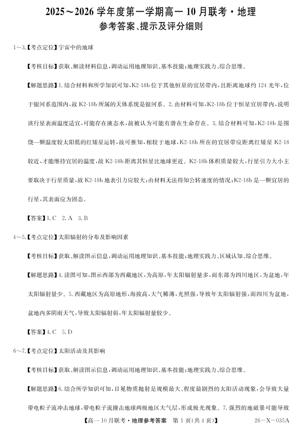 高一地理答案--安徽省县中联盟2025~2026学年度第一学期高一10月联考