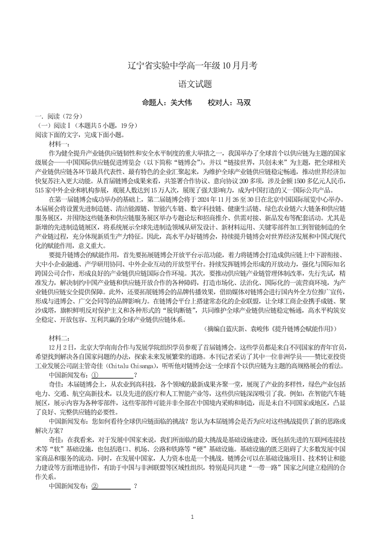 高一语文+答案--辽宁省实验中学2025-2026学年度上学期高一10月月考