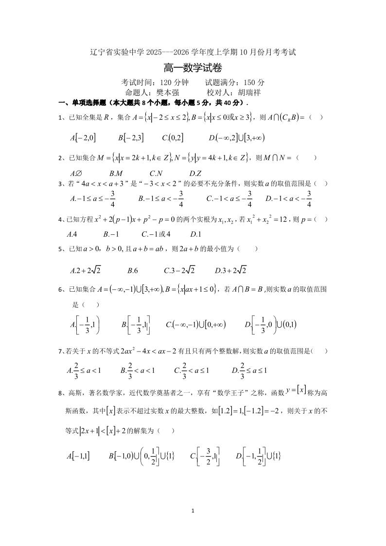 高一数学+答案--辽宁省实验中学2025-2026学年度上学期高一10月月考