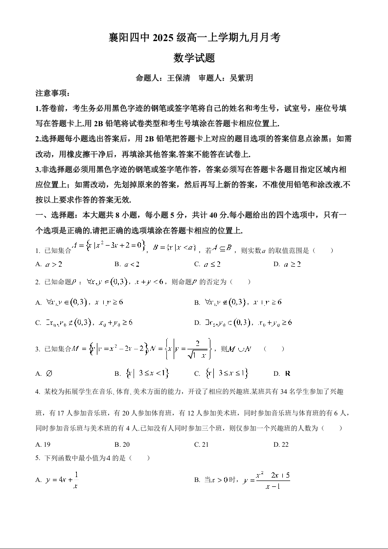 高一数学--湖北省襄阳市第四中学2025-2026学年高一上学期9月月考