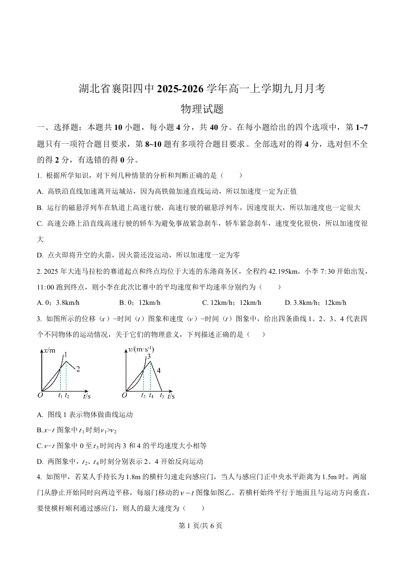高一物理--湖北省襄阳市第四中学2025-2026学年高一上学期9月月考