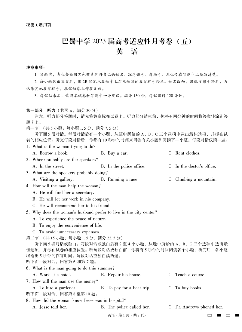 高三英语-重庆市巴蜀中学2023届高考适应性月考卷(五)
