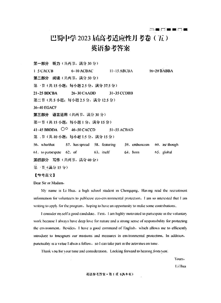 高三英语答案-重庆市巴蜀中学2023届高考适应性月考卷(五)